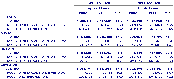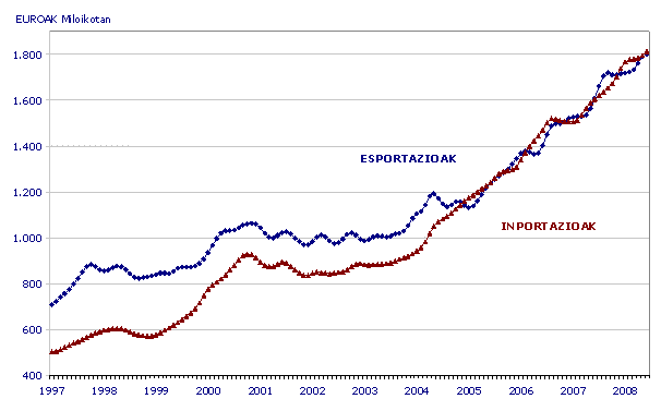 2008ko bigarren hiruhileko honetan, Europar Batasuna helburu duten esportazioak %16,9 hazi dira, 2007eko bigarren hiruhilekoaren aldean. Nabarmentzekoak dira, urte arteko hazkundeagatik eta bolumenagatik, hauetara egindakoak: Frantzia (%21,5), Alemania (%26,5), Belgika (%67,7) eta Portugal (%18,8). 27-EBtik kanpo AEBtara egindako esportazioak aipatu behar, %35,3 hazi baitira.