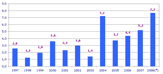 Sektorean kontsumitu diren lehengaien prezioari dagokionez, azken hamabi hilabeteetan inflazio-tasa handienak izan dituztenak ondokoak izan dira: petrolioaren birfinketa (%18,9), mineral ez-metalikoak (%15,2), energia elektrikoa eta gasa (%11,9) eta ura (%11,4). Bestalde, ondoren ematen diren ataletako lehengaien prezioak urte batetik bestera (2007ko ekainetik 2008ko ekainera) gutxitu egin dira: material elektrikoa (-%3,0), zuraren industria (%2,4) eta makinak (%2,5).