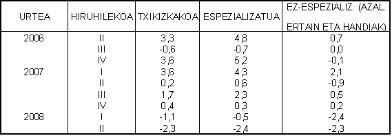 Txikizkako merkataritza espezializatuan, urte arteko hazkunde-tasarik handiena pertsonen hornikuntzako sektoreari dagokio; %3,3ko hazkunde nominala izan du; balio errealetan, %3,9koa. Elikagaiek %2,6ko hazkundea izan dute balio nominaletan; horrenbestez, tasa negatiboa izan da, balio errealetan -%2,8koa. Etxeko hornikuntzarako produktuen salmentak %1,3 jaitsi dira urteko eurotan; balio errealetan, aldiz, %3,5ko beherakada izan da. Beste alde batetik, bestelako kontsumo-ondasunek %3,0ko gutxitze nominala izan dute; hau da, balio errealetan, gutxitze horrek %3,5ko tasa izan du.