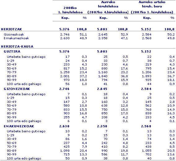 2008ko lehenengo hiruhilekoan, Euskal AEn 5.376 lagun hil ziren, iazko aldi berean baino %4,3 gehiago, EUSTATen datuen arabera. Lurraldeka, Bizkaian 2.960 pertsona hil ziren, %7,3 gehiago; 1.470 (%+7,3) Gipuzkoan, eta Araban 676, 2007ko lehenengo hiruhilekoan bezalaxe.