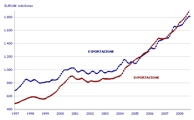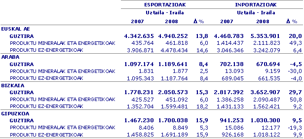 Euskal AE osotara hartuta, bolumen handieneko muga-zergen sekzioek eragin zuten hiruhileko horretako esportazioen bilakaera positiboan, batez ere Metalak eta beren manufakturak, zeinen salmentak %41,2 hazi diren atzerrian, eta Material elektrikoa, %9,7. Garrantzitsuak dira, baita ere Produktu Mineralen (%6,0) eta Plastiko eta kautxuaren (%11,6) hazkundeak. Kontrako norabidetik jo du Garraio Materialaren muga-zergen sekzioak, %-7z murriztu baita. Inportazioen atalean, Metalak eta euren manufakturak %20,5 igo ziren, eta Produktu mineralak %49,3; baina Garraio-materiala %28,8 jaitsi zen.