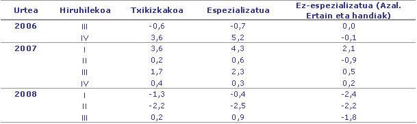 Txikizkako merkataritza espezializatuaren eremuan, pertsonaren ekipamendu sektoreak izan du urte arteko hazkunde-tasa handiena, izan ere, %7,4ko hazkunde nominala jasan du, %7,5ekoa, balio errealetan. Elikagaiak sektoreak ere %2,6ko gehikuntza izan du balio nominaletan, -%2,1eko tasa negatiboa, balio errealetan. Bestelako kontsumo-ondasunak alorrean, produktuen salmentak %1,8 igo dira euro arruntetan, %0,4ko hazkundea lortuz, balio errealetan. Bestalde, Etxeko ekipamendua alorrean, produktuek %3,9ko beherakada jasan dute, %6,3ko jaitsiera, balio errealetan.
