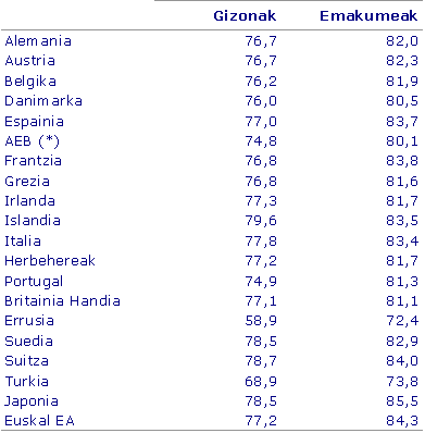 Euskal AEko gizon zein emakumeek bizi-itxaropenaren etengabeko hazkundea izan dute. Orain hogeita hamar urteko adierazleak (69,6 urte gizonentzat, 76,9 emakumeentzat) ikusita, bizi-itxaropena 7,4 urtez hazi da emakumeentzat eta 7,6 gizonentzat). Urtean-urtean hiru bizi-hil irabaziz, gizonena 77,2 urtetan da eta emakumeena 84,3tan. Bi sexuen arteko aldea orain 15 urteko 8,7ko maximotik 7,1 urtera etorri da.