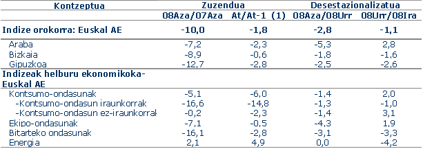 Sektoreen arabera, eta industriako sektore nagusien sailkapenari jarraiki, 2008ko indizearen bilakaerak ondoko aldakuntzak izan zituen, 2007ko azaroaren aldean: sektore guztiek jaitsiera jasan zuten, Energia sektorea izan ezik, % 2,1 hazi baitzen. Bitarteko ondasunek % 16,1 egin zuten behera, ekipamendukoak % 7,1; kontsumo-ondasunek ere % 5,1eko murrizketa izan zuten, izan ere, bai Kontsumo-ondasun iraunkorrak (-% 16,6), bai kontsumo-ondasun ez iraunkorrak (-% 0,2) jaitsi egin ziren.