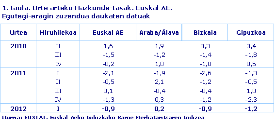 2012ko lehen hiruhilekoan Euskal AEko txikizkako merkataritzaren salmenta errealetan %0,1eko jaitsiera izan da 2011ko laugarren hiruhilekoaren aldean eta urtaro-eraginak kenduta.
