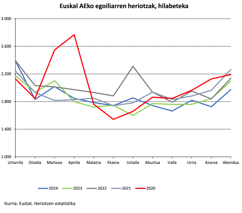 Hilabeteei dagokienez, uztaila nabarmendu da. Izan ere, heriotzen kopuruak % 15,9ko igoera izan du 2023ko hilabete berarekin alderatuta (1.854 heriotza), 2022ko uztaileko kopuruaren azpitik geratu bada ere.
