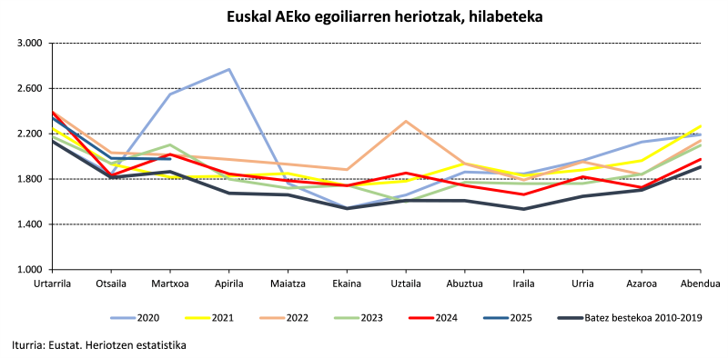 2025eko lehen hiruhilekoan, Euskal AEn 6.300 pertsona hil ziren, aurreko urteko aldi berean baino % 1 gehiago, Eustaten datuen arabera. Heriotzak % 8,3 gehitu ziren otsailean eta % 2,1 eta % 2 jaitsi ziren urtarrilean eta martxoan, hurrenez hurren, 2024aren aldean.