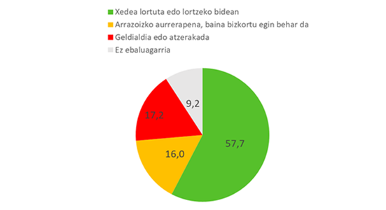 Euskadiri buruzko informazioa duten adierazleak bakarrik kontuan hartuta (hau da, aplikagarriak ez direnak eta gaur egun daturik ez dutenak kontuan hartu gabe), adierazleen % 57,7an helburua lortu da edo 2030a baino lehen lortzeko bidean dago, % 16an arrazoizko aurrerapena eman da, baina beharrezkoa da bizkortzea helburua lortzeko, eta % 17,2an geldialdian edo atzerakadan dago Euskadi. Adierazleen % 9,2an, gaur egun, aurrerapena ezin da ebaluatu, ez baitago nahikoa datu edo testuinguruari buruzko nahikoa informazio.