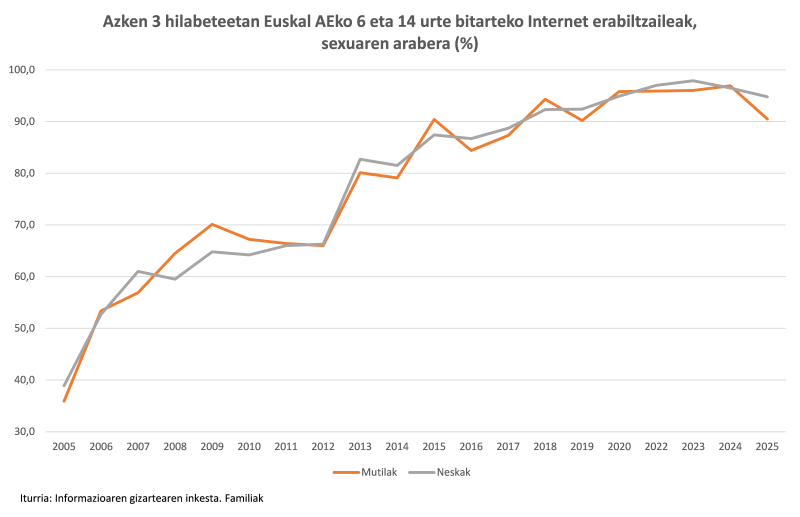 Azken 3 hilabeteetan Internet erabili duten 6-14 urteko pertsonak adin horietako euskal herritarren % 92,6 dira; ehuneko horrek 3,7 portzentaje-puntuko igoera izan du 10 urtetan (% 88,9 2015ean). Adin horietako erabiltzaileen % 57,6 gutxienez astean 5 egunetan konektatzen dira.