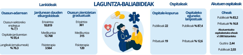 Osasun-jardueretan lan egiten duten langileak 67.315 dira 2024an, hau da, enplegu guztiaren % 7,1. Enplegu hori % 8,4 hazi da 2020koarekin alderatuta, eta gehienak ospitale-jardueretara bideratu dira (% 55,4). Osasun-laguntzako giza baliabideei dagokienez, emakumeak dira nagusi osasun-arloko lanbideetan (% 76,3).