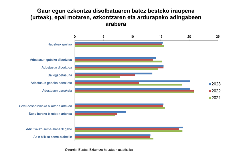 Zuzeneko dibortzioak 3.090 izan ziren guztira 2023an; horietatik 2.360 adostasunekoak izan ziren (% 76,4) eta 730 adostasunik gabekoak (% 23,6). Banantzeak 121 izan ziren, 104 adostasunekoak (% 86) eta 17 adostasunik gabekoak (% 14). 2022ari dagokionez, adostasuneko dibortzioak 2.315 izan ziren, eta adostasunik gabekoak 564; adostasuneko banantzeak, berriz, 80 izan ziren eta adostasunik gabekoak 14.